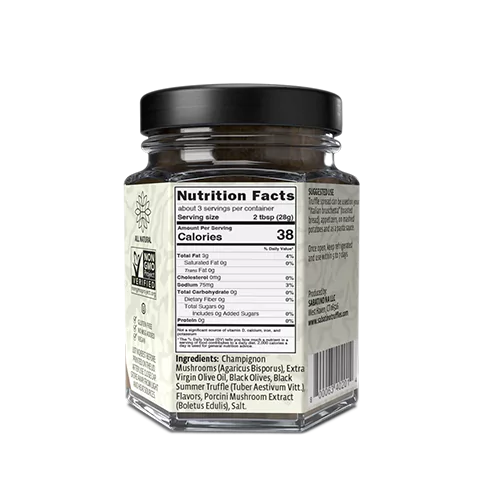 A savory and earthy blend of summer truffles with button mushrooms, parsley, and olive oil. With a pesto-like consistency. Use as a spread for canapés and crostini, spoon onto pizza, or use to enhance cream or mushroom sauces.